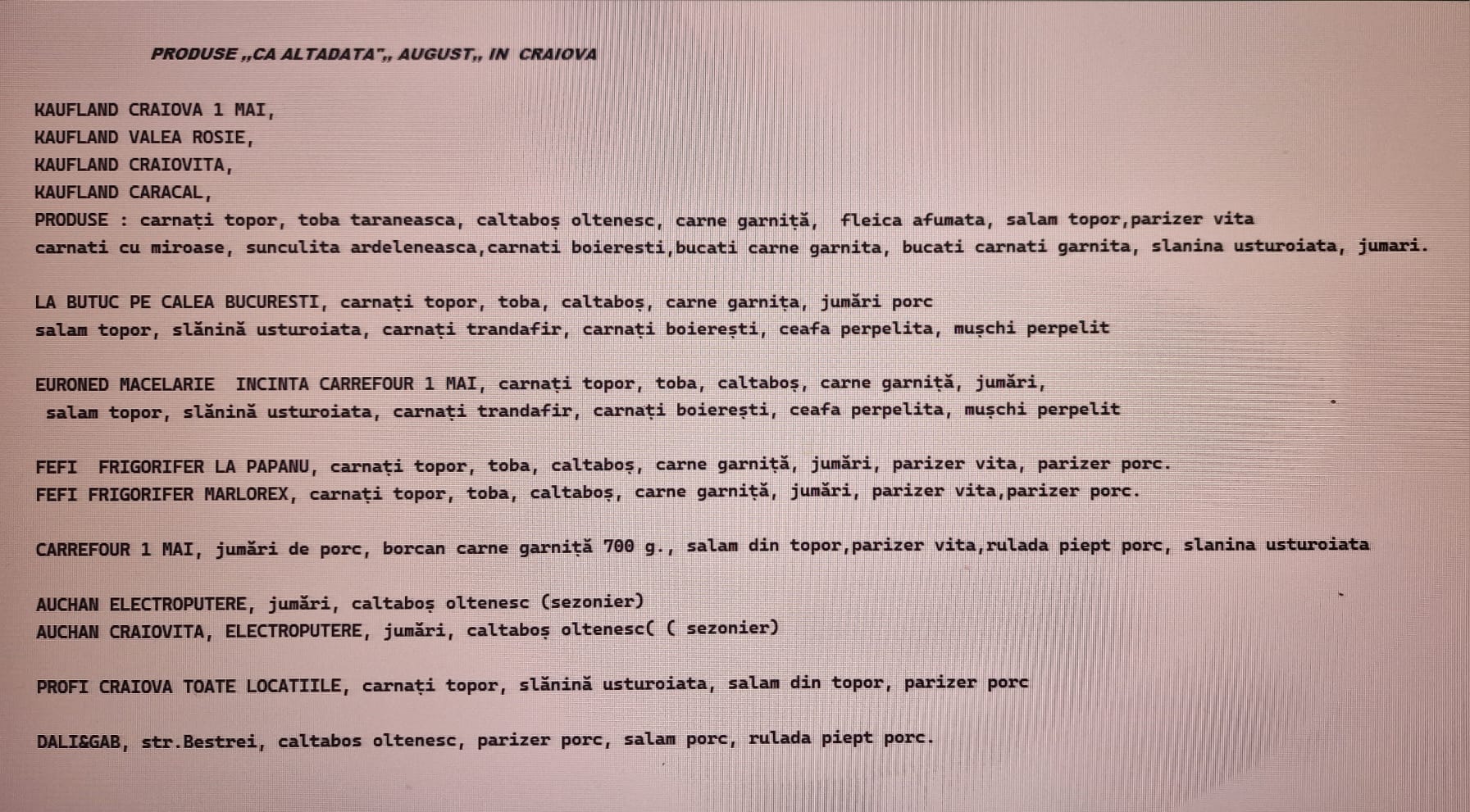 ”As is the old time” products Beef Commercial products ”As is the old time” products Lean meat Produs tradițional atestat MADR Detalii lamb pastrami Produs tradițional atestat MADR Detalii Smoked pastrami Produs tradițional atestat MADR Detalii Sausage ”with ambition” Produs tradițional atestat MADR Detalii Sausages with spices and garlic Produs tradițional atestat MADR Detalii Sausages ”cut with the ax” Produs tradițional atestat MADR Detalii Salo with garlic Produs tradițional atestat MADR Detalii Pork greaves Produs tradițional atestat MADR Detalii Smoked can meat Produs tradițional atestat MADR Detalii Beef Sausage ”with ambition” Produs tradițional atestat MADR Detalii Commercial products Salami ”cut with the ax” Detalii Pork thick rosy sausage Detalii